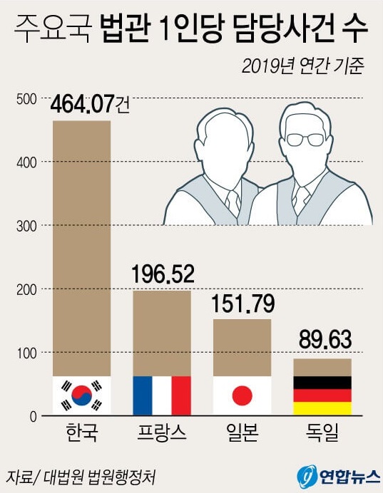아래 그래픽으로도 법관이 얼마나 부족한지 알 수 있습니다. 판사 증원 요구가 오래 전부터 있었지만 10년 동안 그대로 입니다. 이로 인한 재판 지연, 부실 재판은 국민 인권과 관련된 심각한 문제입니다. 의사 때문에 사람이 죽고 사는 것 못지 않습니다.