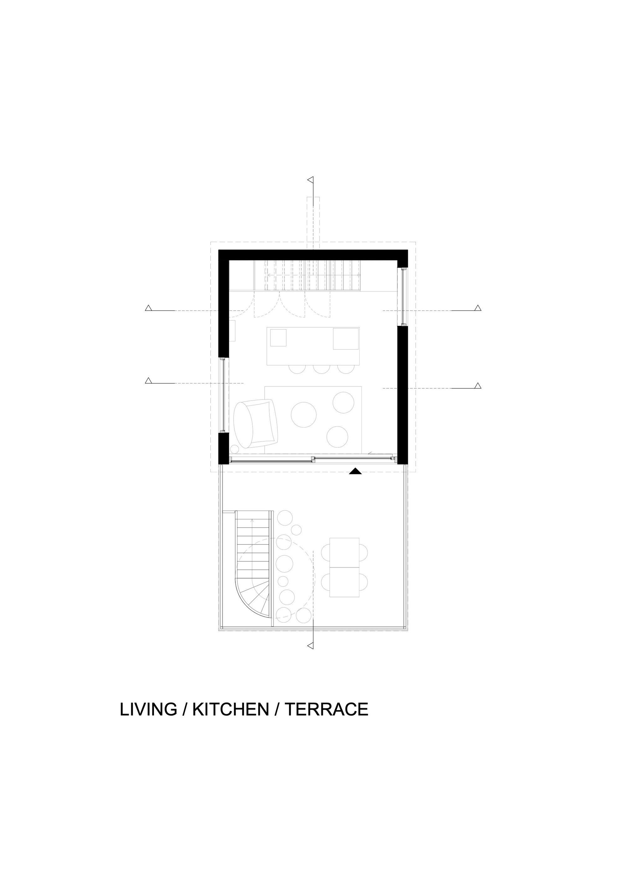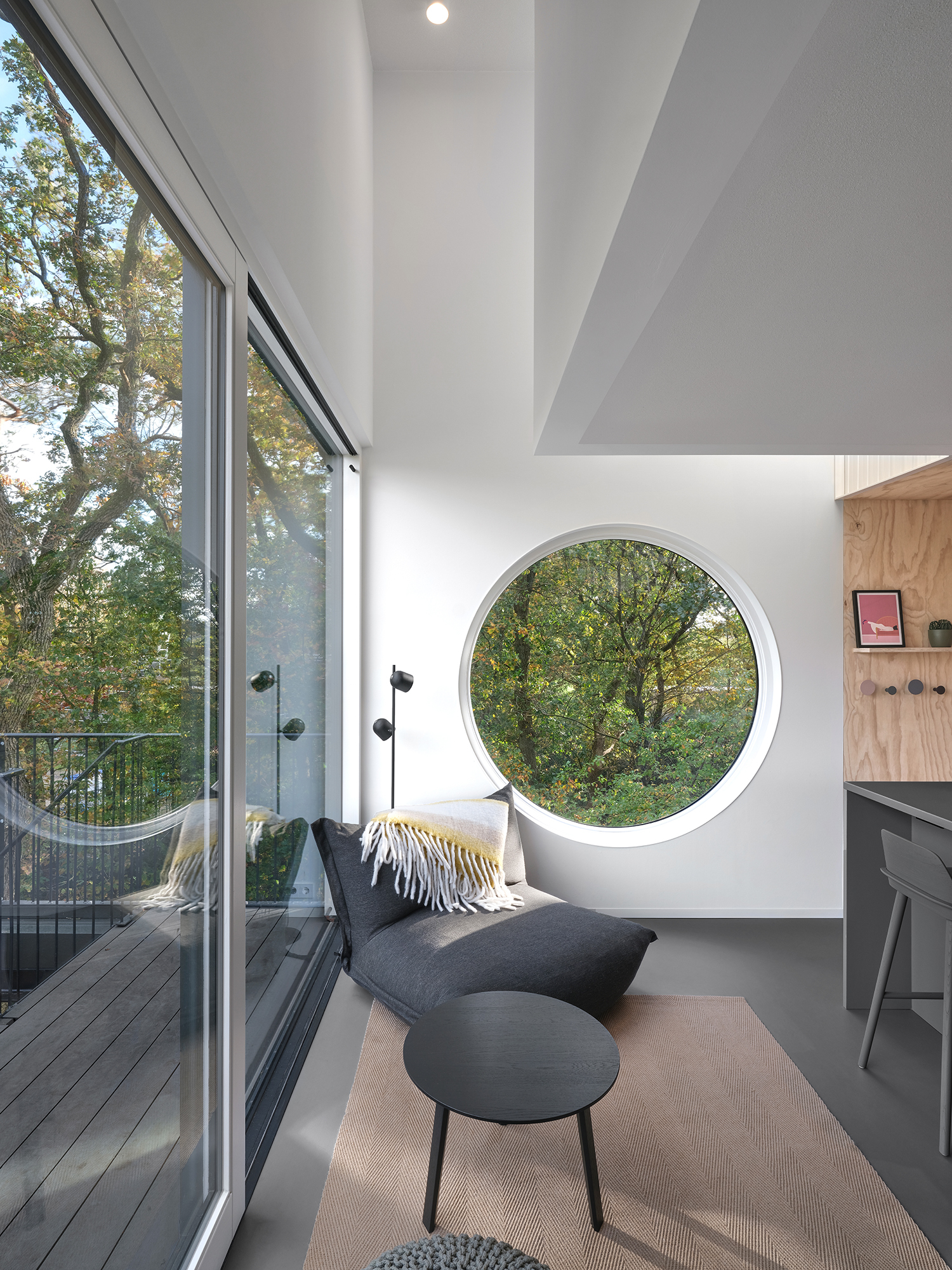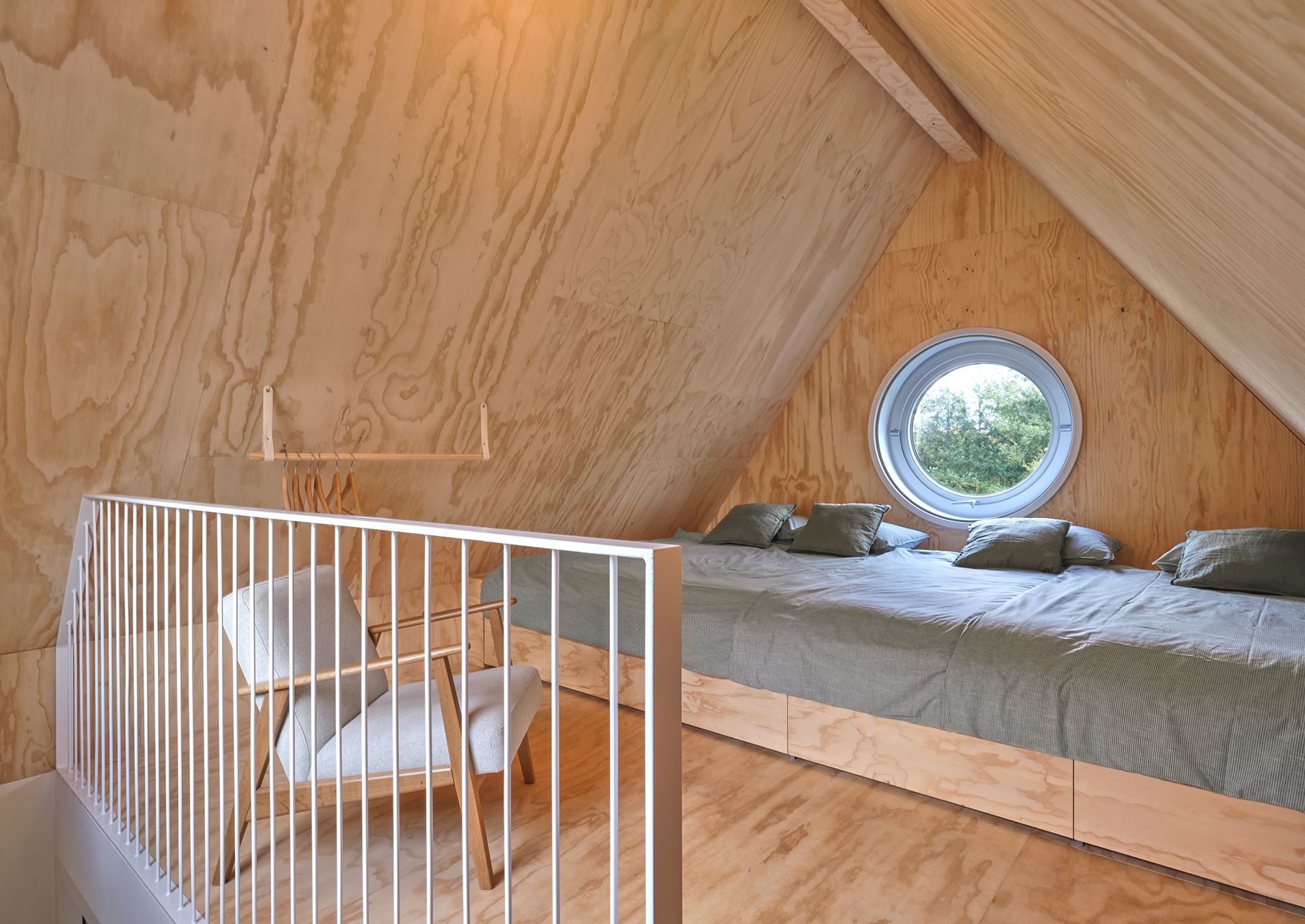숲속에 트리하우스 콘셉트로 올려서 지은 네덜란드 농막입니다. 정확한 평수는 나와 있지 않지만 설계도면상으로 볼 때 1층 바닥 면적이 4, 5평 정도로 보입니다. 1층이 지면에서 8m 정도 높이에서 시작하는 3층 구조입니다. 1층은 부엌과 다이닝을 겸한 작은 거실이 있고 지상에서 올라오는 계단이 있는 외부 공간이 고층의 데크 형태로 붙어 있습니다. 2층은 가운데 욕실과 화장실을 두고 둘레를 복도처럼 활용하도록 만들었습니다. 3층은 2명 정도는 여유 있게 쉬거나 잘 수 있는 침실 공간입니다. 나무를 감싸고 짓지 않았지만 큰 나무 곁에 붙이거나 데크 공간 가운데나 한쪽에 나무를 감싸고 지어도 좋을 듯합니다. 건축사무소 NAMO Architecture, i29 architects에서 설계했고, 사진 작업은 Jeroen Musch가 맡았습니다. 더 자세한 내용은 건축 전문사이트 아크데일리(www.archdaily.com/1013415/buitenverblijf-nest-namo-architecture-plus-i29-architects?ad_source=search&ad_medium=projects_tab)에서 살펴볼 수 있습니다.