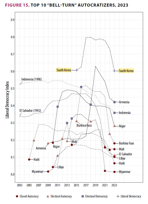 스웨덴 예테보리 대학에 본부를 둔 민주주의다양성 연구소는 4월 7일 공개한 연례보고서 ‘민주주의 리포트 2024’에서 한국이 민주주의 국가에서 독재화로 뒷걸음질친다고 지적했다. 이 연례보고서에 나온 한국 관련 내용은 다음과 같다.
