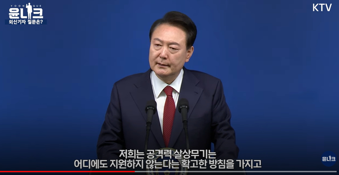 대통령: 지금 우크라이나 전쟁은 힘에 의한 현상변경 시도로 국제법상 허용되지 않는 불법공격이다. 그래서 저희는 대한민국 헌법 정신에 따라 자유와 평화를 준중하는 헌법 정신에 따라 우크라이나에 대한 인도적 지원, 재건 지원에 우리 재정 여건이 허락하는 범위에서 최선을 다하고 있다. 저희는 공격용 살상무기는 어디에도 제공하지 않는다는 확고한 방침을 가지고 우크라이나 지원에 임하고 있다.