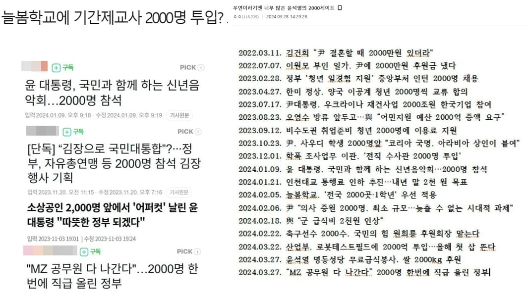 온라인 커뮤니티에 '현 정부가 숫자 2000에 집착하는 것 같다'는 제목의 게시물이 올라 눈길을 끌었습니다. '클리앙'에 이 글을 쓴 한 작성자는 "천공 스승이라는 인간 이름이 이천공이란다"고 했습니다. '윤석열의 2000 게이트'라며 이 정부 들어 정책이나 행사에 유독 2000이라는 숫자가 자주 등장한다는 음모론을 펴는 사람도 있었습니다. 6급 이하 실무직 국가공무원 2,000명의 직급을 올리기로 했다, 대통령이 무료 급식소에 쌀 2,000㎏을 후원했다, 한미 정상이 이공계 분야 청년 인재를 2,000명씩 교류하기로 했다는 등등을 엮은 겁니다.
