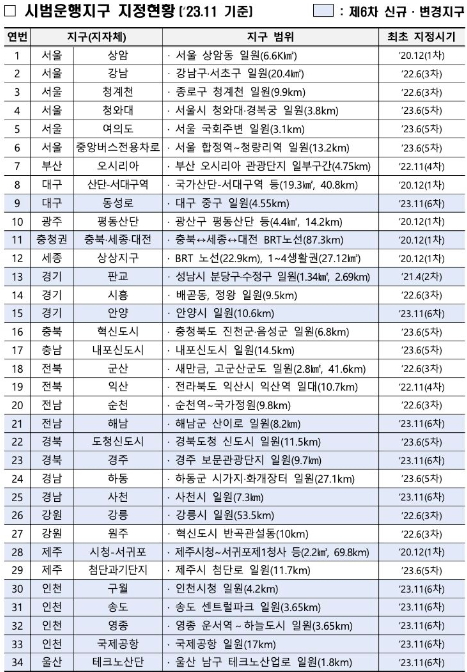 국토교통부는 2023년 6월 22일 기준, 자율주행차 여객·화물 운송 서비스 가능 지역을 전국 15개 시·도 24개 지구로 확대했다. 2020년 5월부터 자율차 시범운행지구를 지정해왔으며, 5차에 걸쳐 지속 확대되어 왔다.