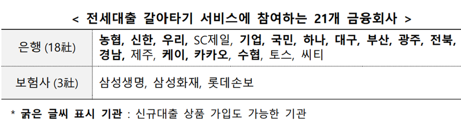 전세 대출 갈아타기는 아파트는 물론이고 오피스텔, 빌라, 단독주택 등 모든 주택에, 전세, 월세 등 임대차 계약의 모든 형태에 적용됩니다. 다만, 한국주택금융공사(HF), 주택도시보증공사(HUG), SGI서울보증의 보증서를 담보로 한 대출이어야 합니다. 그리고 기존 대출의 대출 보증을 제공한 보증 기관과 동일한 보증 기관의 보증부 대출로만 갈아타기를 할 수 있습니다.
