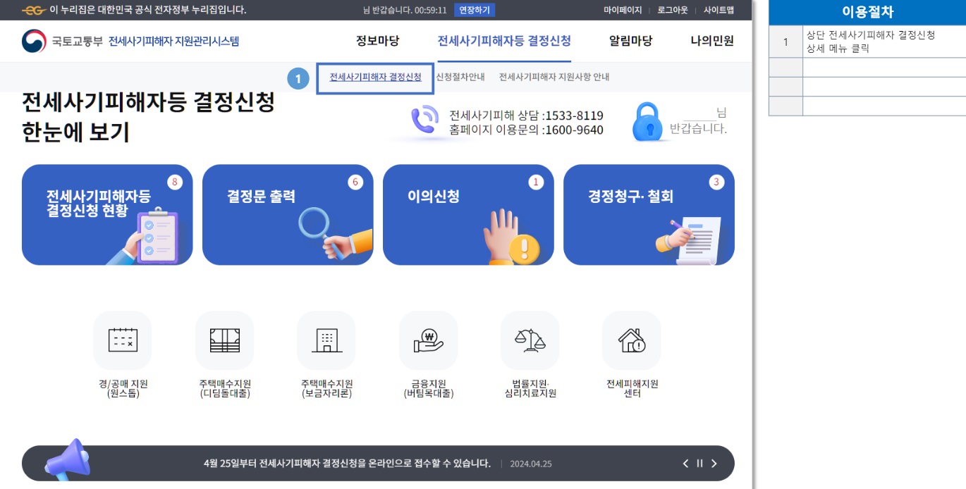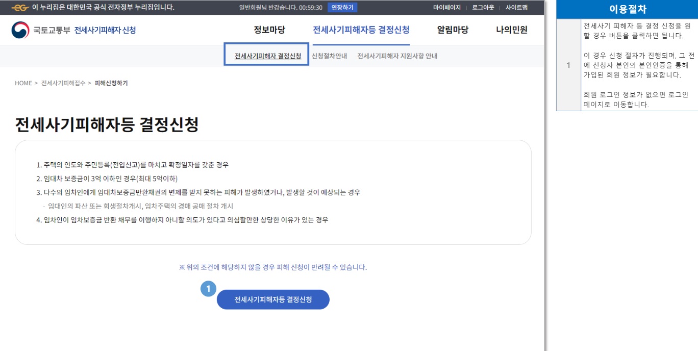 ②다시 홈 화면에서 위쪽 오른편의 '전세사기 피해자 등 결정 신청'에 마우스 커서를 올려 '전세사기 피해자 결정 신청'을 클릭합니다.