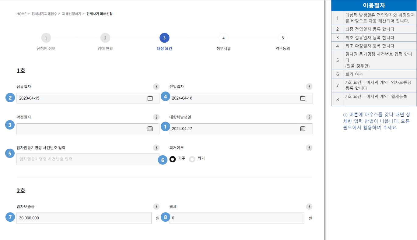 ⑧전입일자, 점유일자, 확정일자 등 대상 요건과 관련된 정보를 입력합니다. 그 다음 페이지에서 경매, 공매, 파산, 압류 등 진행 중인 절차가 있으면 그 내용도 입력합니다.