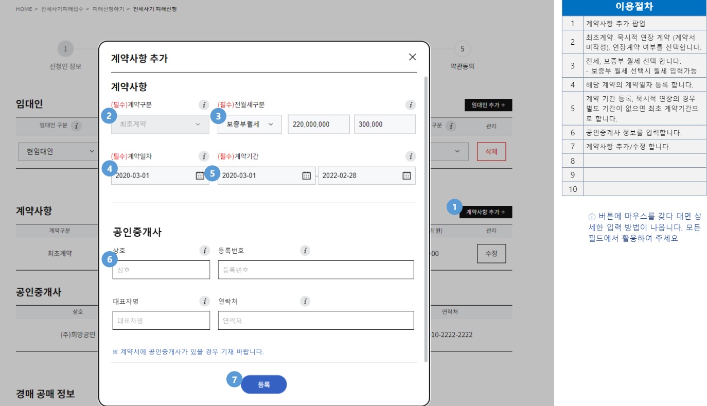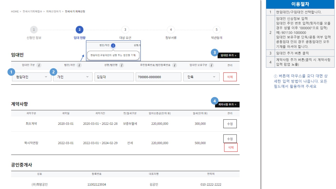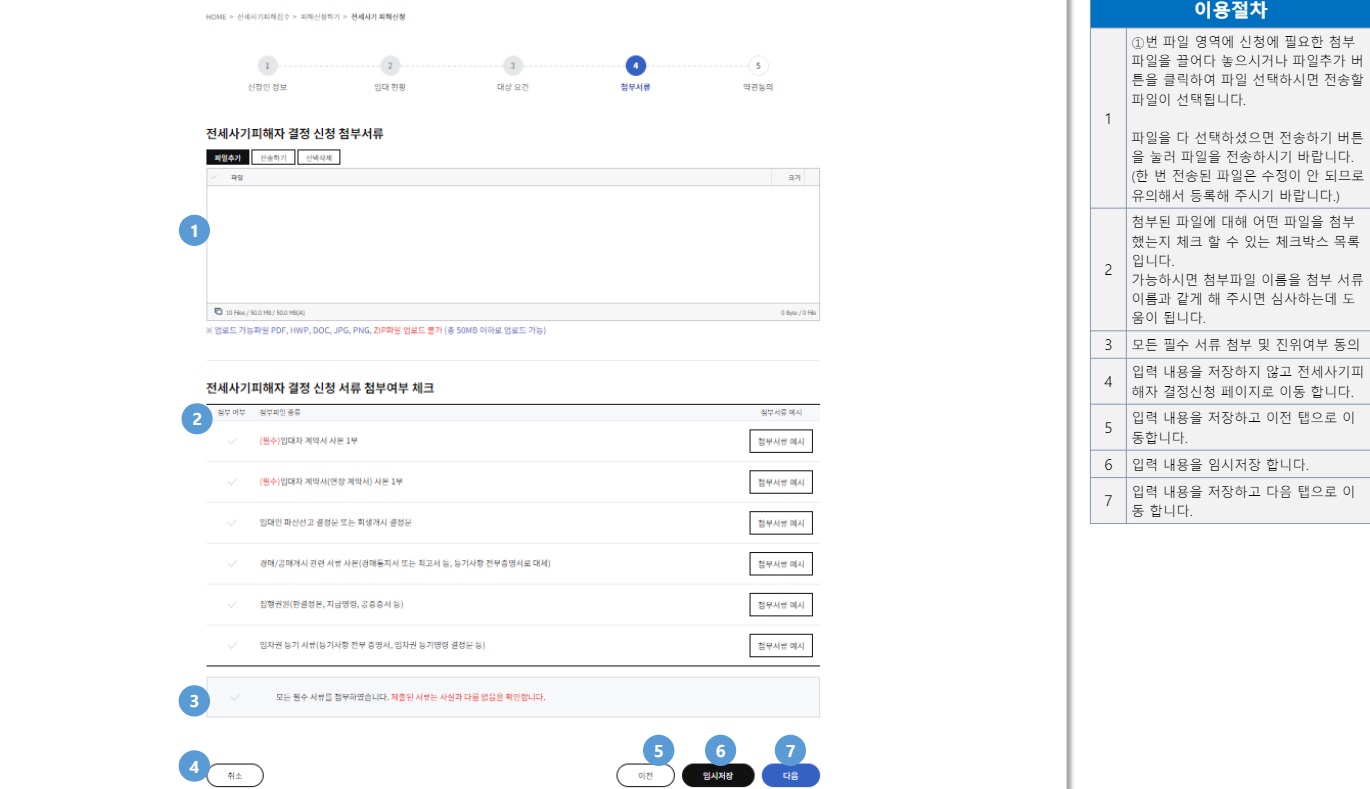 ⑩피해자 신청에 필요한 서류들을 준비해 두었다가 첨부 파일로 올립니다. 필수인 서류는 임대차 계약서 사본과 임대차 연장 계약서 사본입니다. 기타 임대인 파산 선고 결정문이나 회생 개시 결정문, 경매·공매 개시 관련 서류 사본, 판결정문·지급명령·공증증서 등 집행권원, 임차권 등기 서류(등기 사항 전부 증명서, 임차권 등기 명령 결정문) 등 해당 사항이 있으면 서류를 사진으로 찍어 입력할 수 있습니다. 이후 개인정보 이용에 동의하고 신청을 완료하면 됩니다.