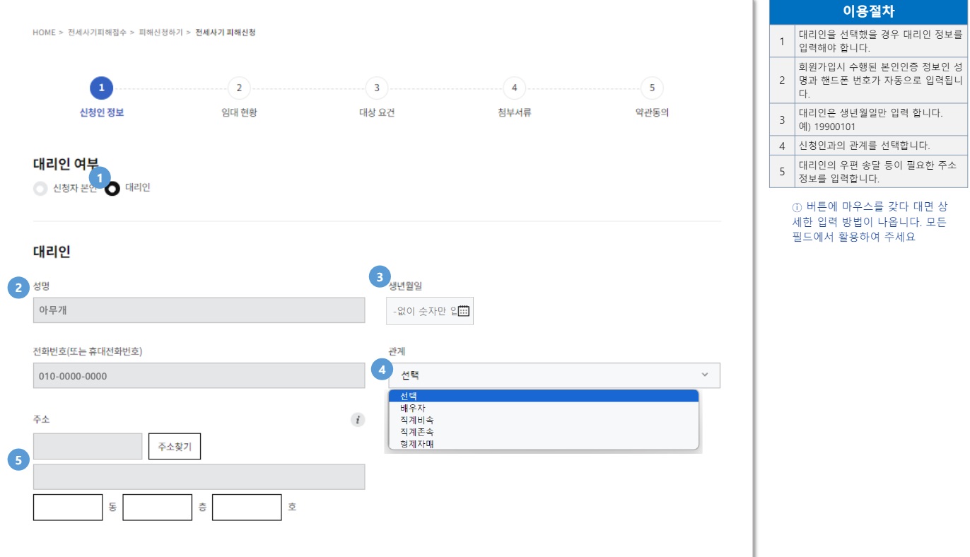 ⑤피해자 본인이 아니고 대리인일 경우 대리인의 인적 사항, 피해자와 관계 등을 입력하고 다음으로 넘어갑니다.