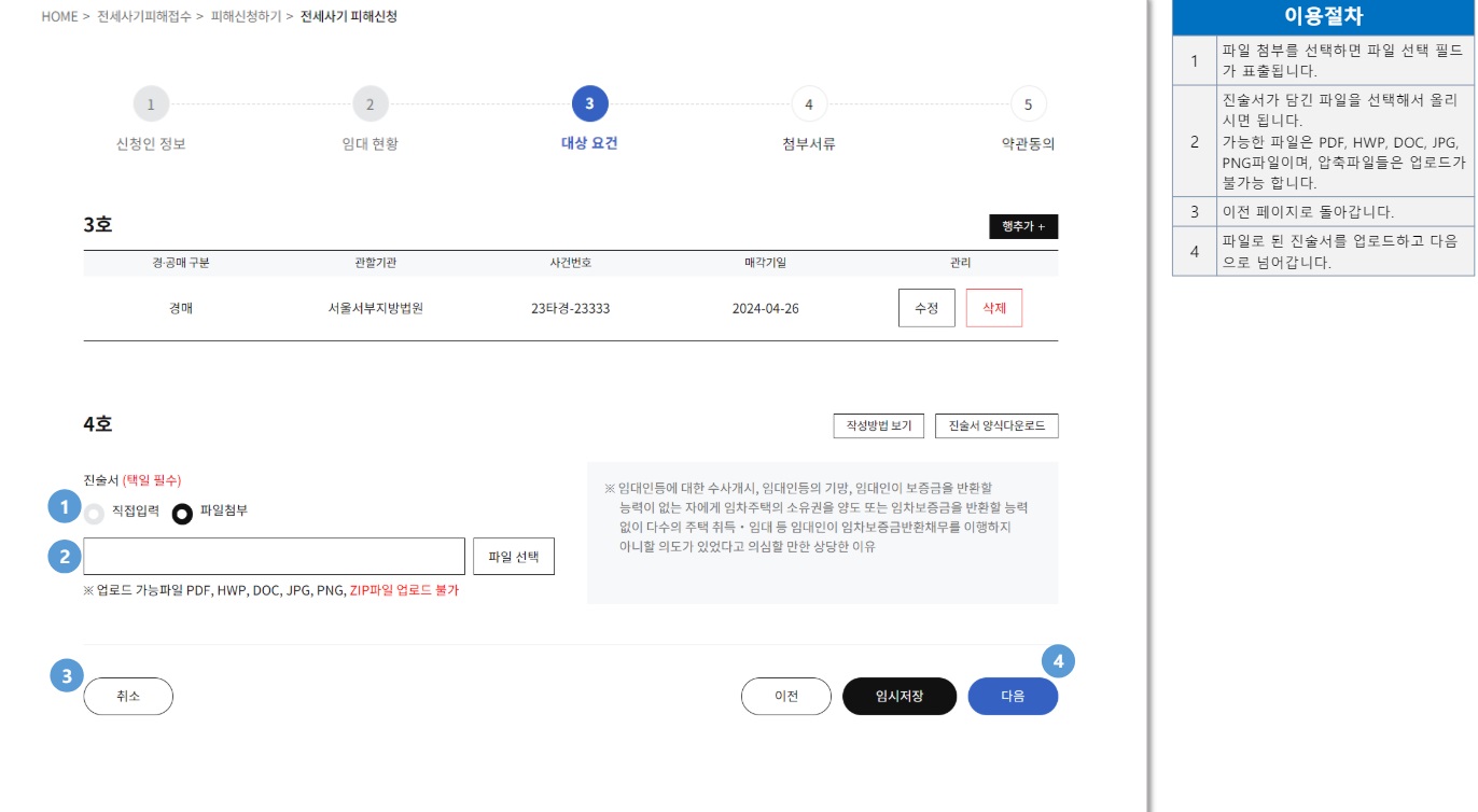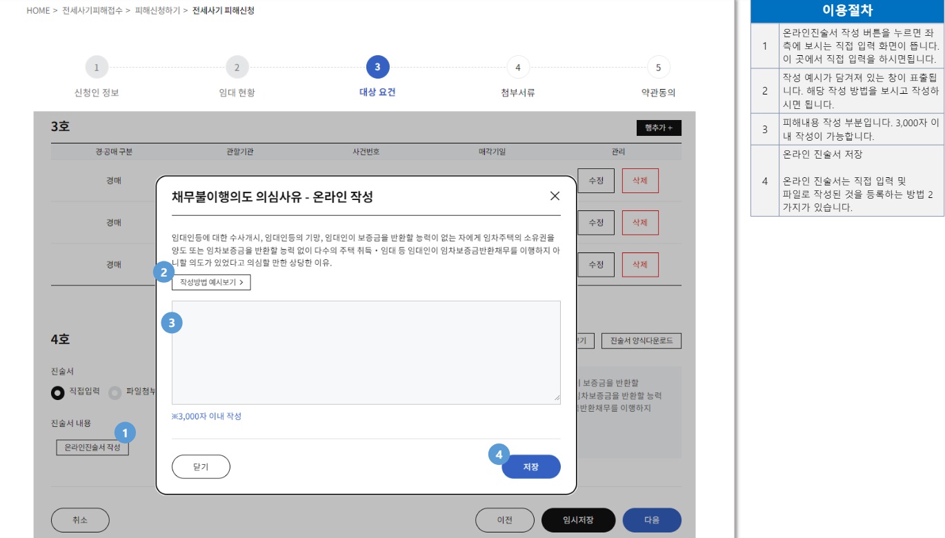 ⑨피해자 진술서와 채무불이행 의도 의심 사유를 작성해 첨부하거나 직접 입력합니다.