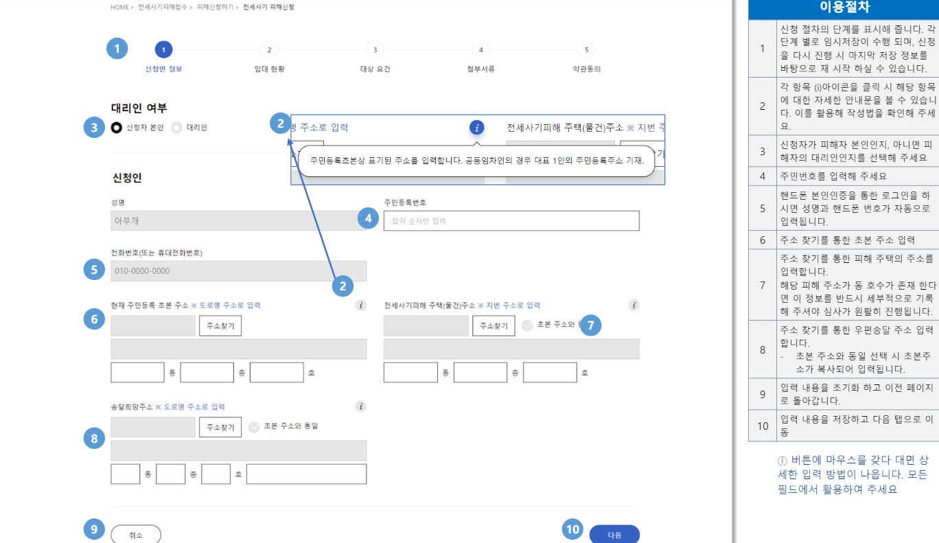 ④자신의 이름, 주민등록번호, 전화번호, 주민등록초본 주소, 전세사기 피해 주택 주소, 송달 희망 주소 등을 입력하고 다음을 누릅니다.