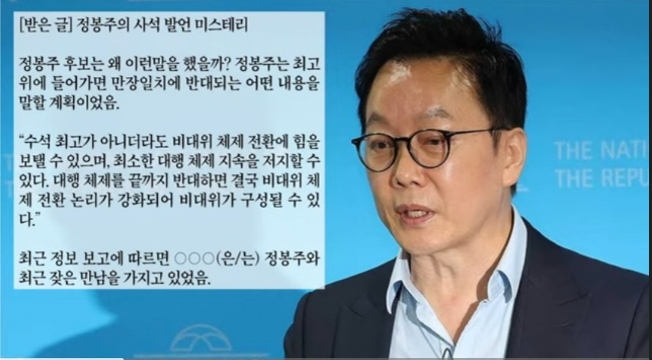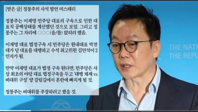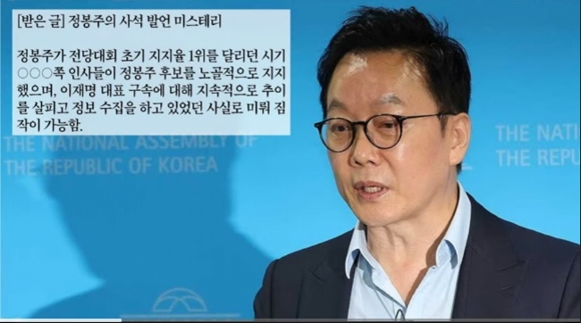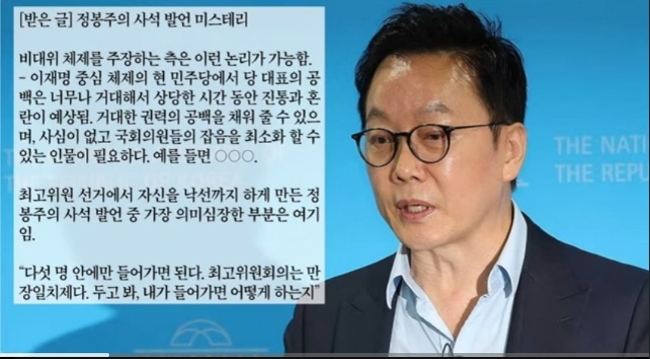 이 글을 알고 지내던 기자로부터 받았다고 말했다. 또 그 기자는 민주당 당직자로부터 이 글을 받았다고 전했다. 사실로 확인된 것은 아니나 정봉주 후보의 갑작스런 돌출발언에 대한 의미있는 해석으로 보인다. 사실상 반이재명 입장에서 계획된 발언이라는 주장이다. 정봉주 후보가 해명해야 할 내용이다.