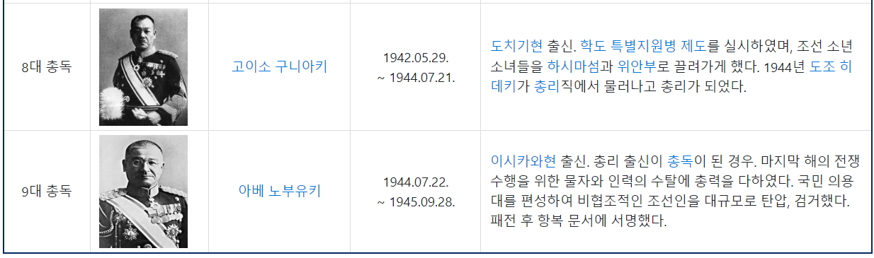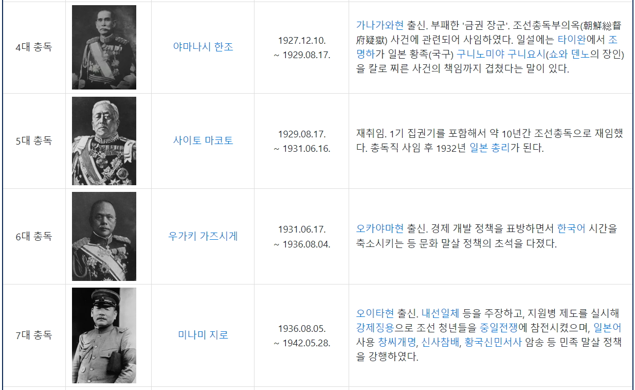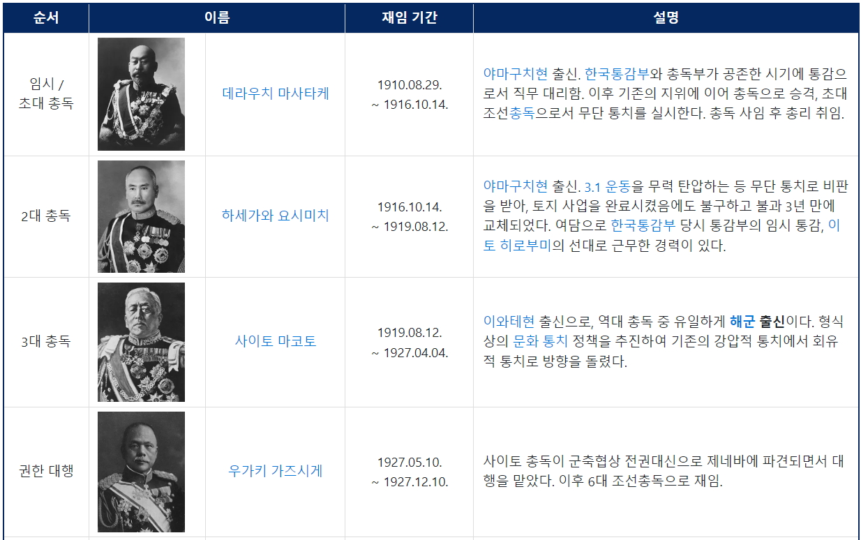 이쯤에서 조선총독이 몇 명인지 알아보자. 나무위키가 표로 잘 정리해뒀다. 어두운 역사를 직시하는 차원에서 다시 한번 보도록 하자.