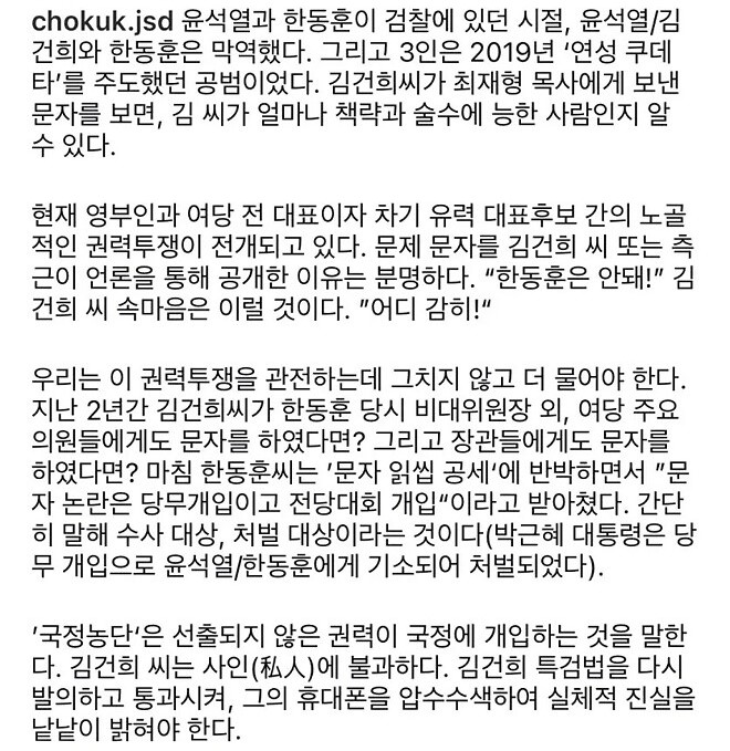윤석열과 한동훈이 검찰에 있던 시절, 윤석열/김건희와 한동훈은 막역했다. 그리고 3인은 2019년 '연성 쿠데타'를 주도했던 공범이었다. 김건희씨가 최재형 목사에게 보낸 문자를 보면, 김씨가 얼마나 책략과 술수에 능한 사람인지 알 수 있다.
