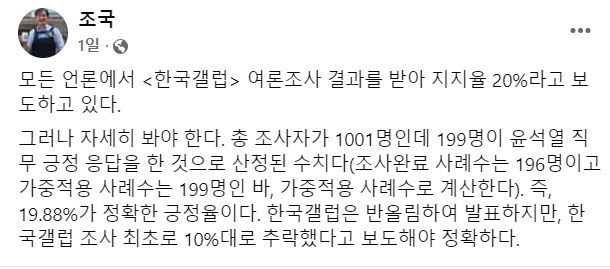조국 조국혁신당 대표는 25일 자신의 페이스북에 글을 올리고 "모든 언론에서 한국갤럽 여론조사 결과를 받아 지지율 20%라고 보도하고 있다. 그러나 자세히 봐야 한다. 총 조사자가 1001명인데 199명이 윤석열 직무 긍정 응답을 한 것으로 산정된 수치다"라고 말했다. 즉, 대통령 지지율 20%대가 무너진 것이라는 주장이다.