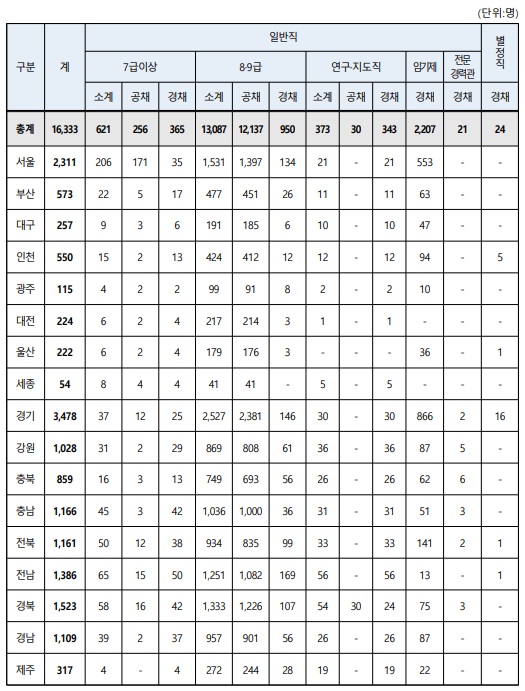 올해 지방공무원은 공개경쟁 임용시험으로 1만 2,423명을, 경력경쟁 임용시험으로 3,910명을 채용할 예정이라고 합니다. 직종별로 일반직공무원이 1만 6,309명, 별정직공무원이 24명입니다. 이 중 일반직은 7급 이상이 621명, 8·9급이 1만 3,087명, 연구·지도직이 373명, 임기제가 2,207명, 전문 경력관이 21명입니다. 직렬별로는 행정직이 5,278명, 시설직 2,487명, 사회복지직 969명, 세무직 480명 등입니다. 시·도별로는 경기도가 3,478명으로 가장 많고 이어 서울 2,311명, 경북 1,523명, 전남 1,386명, 충남 1,166명 등의 순입니다.