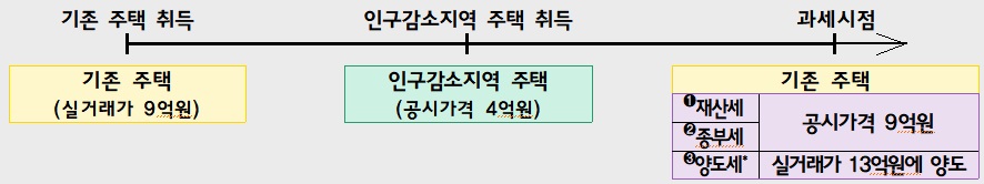 아래 가격의 기존 주택을 30년 이상 보유하면서 그 곳에 거주하고 만 65세 이상인 사람이 아래 그림의 조건으로 인구감소지역에 새로 집을 마련할 경우 세부담 변화는 아래와 같습니다.