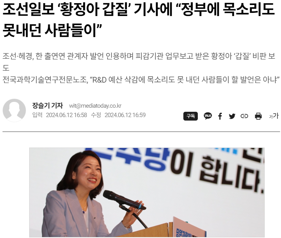 미디어오늘은 12일 조선일보가 같은 날 기사에서 출연연 업무보고를 받은 황정아 더불어민주당 의원이 갑질했다는 식으로 보도했다고 기사를 게재했다. 미디어오늘에 따르면, 이 기사에서 익명의 출연연 관계자가 “대부분 출연연은 대전에 몰려 있는데 보고를 위해 여의도를 찾는 일이 쉽지는 않다”며 “갑작스럽게 30분 보고를 위해 부원장 일정을 조정하느라 당황스러웠다”고 밝혔다.