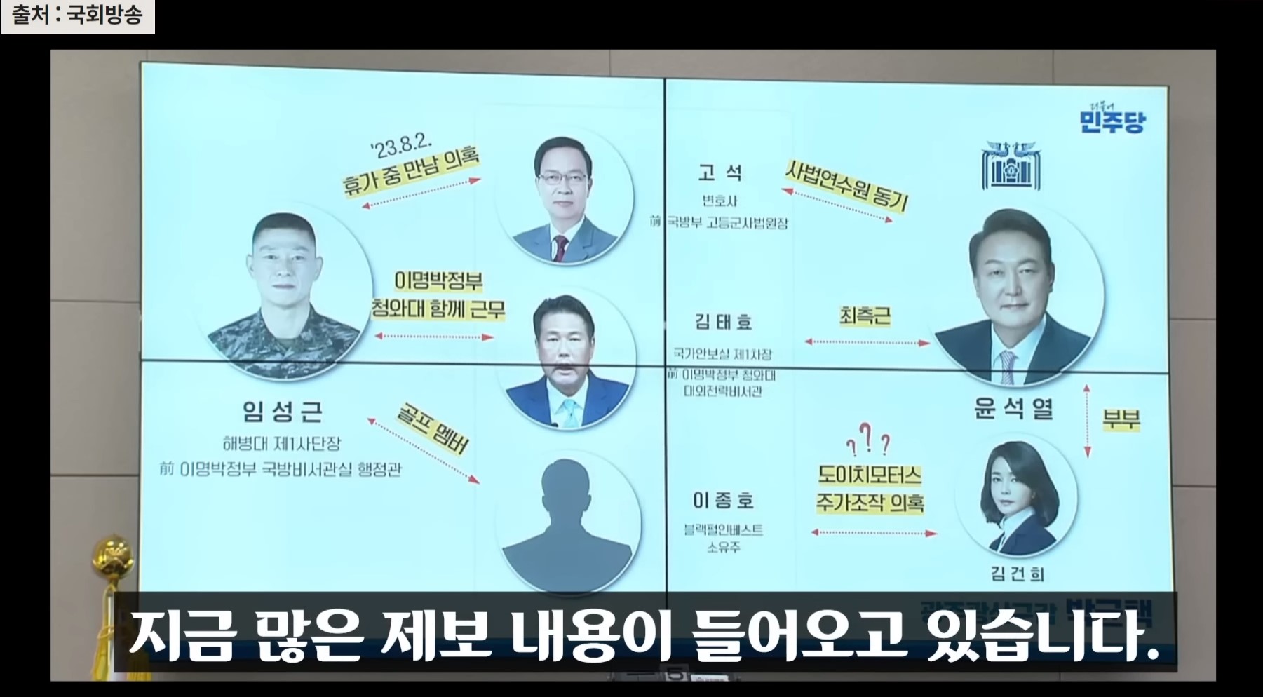 박 의원은 "지금 많은 제보 내용이 들어오고 있다"며 증인으로 출석한 임 전 사단장에게 이렇게 묻습니다. "고석 변호사와 증인이 이 사건 변론 문제로 만났다는 의혹이 제기되고 있습니다. 그리고 김태효 안보실 차장과는 같이 근무했던 인연이 있다고 알려져 있고. 저기 이종호라는 인물은 과거에 해병대 출신, 증인과 아는 사이이고 증인을 위해 노력을 많이 한다고 알려져 있습니다. 그런데도 모릅니까."