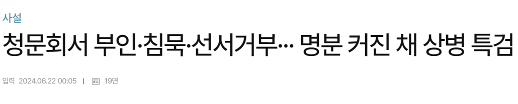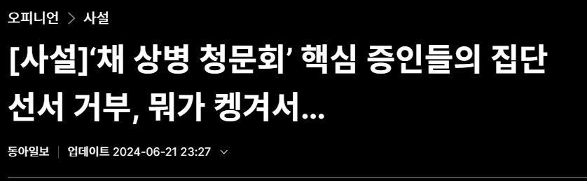 6월 21일 국회 법사위에서 개최된 채해병 특검법 입법청문회에 대하 주요 언론의 입장은 어떨까. 경향신문과 한겨레신문은 특검 필요성을 확인했다고 동일한 입장을 보였다. 한국일보도 마찬가지다. 동아일보는 증인선서 거부에 대해 비판하고 나섰고, 조선, 중앙, 문화, 국민, 세계일보 등 보수 주요 일간지들은 입장을 내지 않았다. 마음이 편치 않은 모양이다.