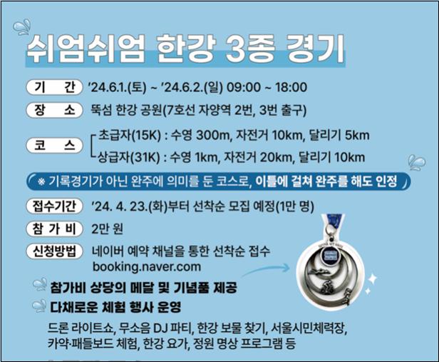 오는 6월 1~2일 이틀 동안 서울 뚝섬한강공원 일대(7호선 자양역 2ㆍ3번 출구)에서 서울시가 마련한 제1회 쉬엄쉬엄 한강 3종 축제가 열립니다. 이 축제는 각자의 체력 수준에 따라 코스를 선택해 이틀간 자신의 속도와 방식으로 수영, 자전거, 달리기 3가지 종목을 완주하는 프로그램입니다.