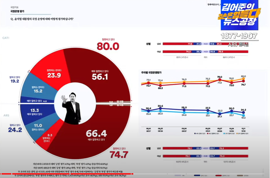 여론조사 '꽃'이 10월 14일 대통령 지지율이 19.2%로 떨어졌다고 발표했다. 현 정권이 취임 이후 첫 10% 여론조사 결과가 나온 것이다. 탄핵 직전의 상황에서 나오는 수치라는 해석이 나온다.