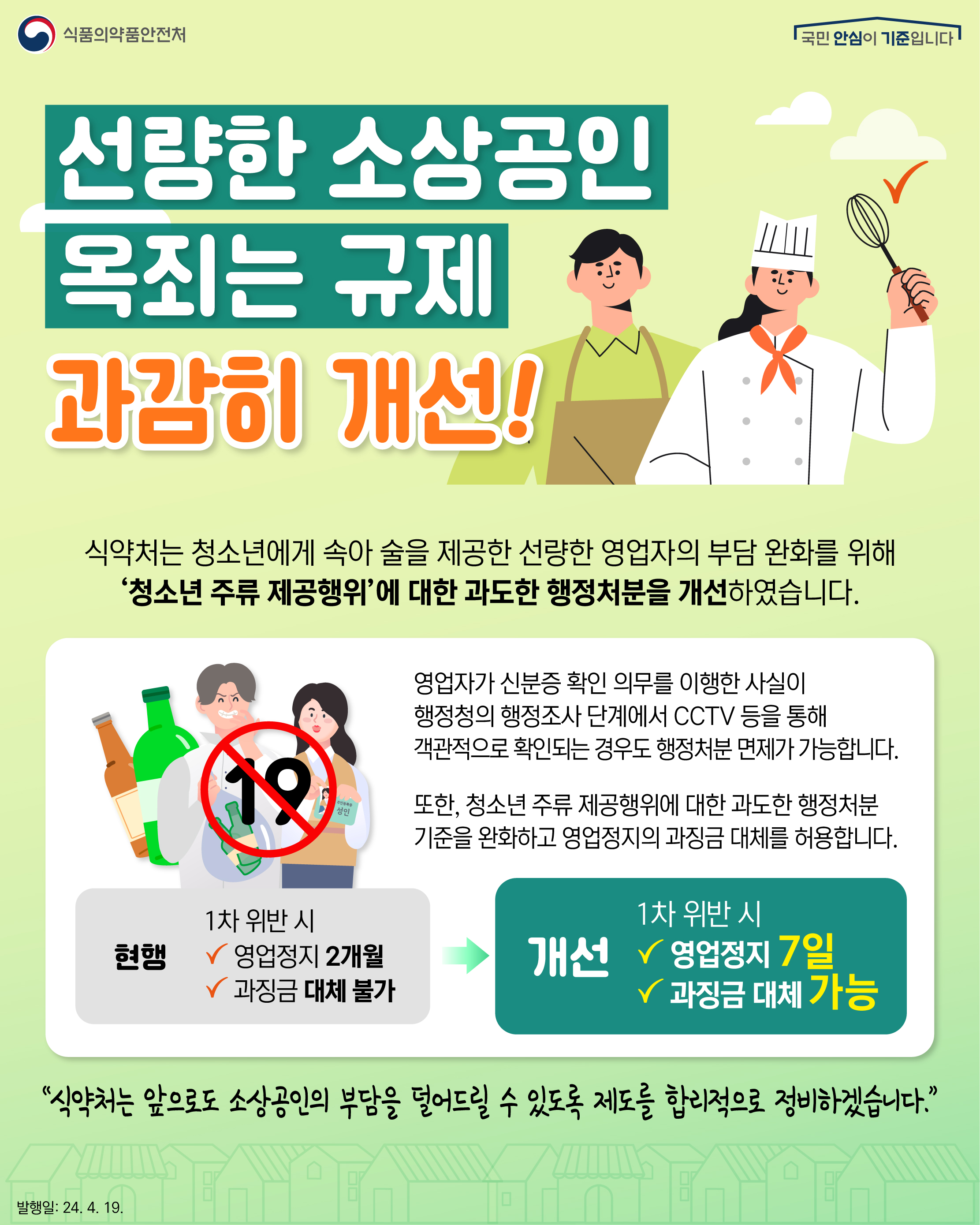 식품의약품안전처는 소상공인의 부담을 완화하기 위해 청소년에게 주류를 제공한 영업자에 대한 행정처분 기준 완화 등을 주요 내용으로 하는 '식품위생법 시행규칙'을 4월 19일 개정·공포했다.