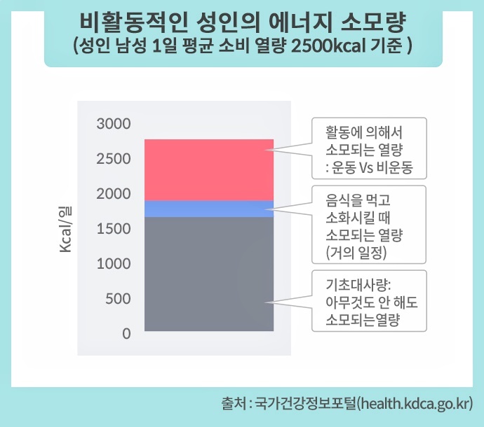 질병관리청에 따르면 우리가 사용하는 에너지는 앉아서 지내는 시간이 많은 성인의 경우 기초대사량이 약 60~70%, 소화시킬 때 소모되는 부분이 약 10%, 활동으로 소모되는 열량이 약 20~30%정도입니다. 사실 소화도 기초대사 활동에 포함되므로 먹어서 생기는 에너지를 소진하는 것은 70~80%가 기초대사인 걸 알 수 있습니다.