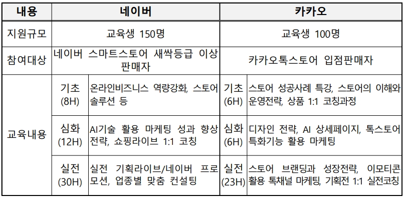 -기초·심화교육생 250개사 (네이버 150개사, 카카오 100개사) →자금대상자 및 실전교육생 60개사 (네이버 35개사, 카카오 25개사)