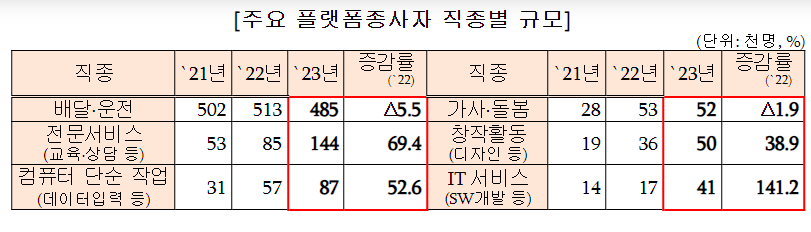 특히, 전년 대비 정보기술(IT) 서비스(141.2%) 및 전문서비스(69.4%) 분야 등에서 높은 증가율을 보였다. 이와 반대로 배달·운전(Δ5.5%) 분야는 과거와 달리 감소로 전환했는데 이는 코로나19 세계적 유행 종료로 인한 배달 수요 감소 등의 영향으로 보이고, 맞벌이 확산, 노령인구 증가 등으로 인한 돌봄 서비스 수요 증가 추세에도 가사·돌봄(Δ1.9%) 분야 종사자가 감소했는데 이는 통계청의 지역별고용조사*와 유사한 결과로서 적정 인력수급이 필요한 상황으로 보인다.
