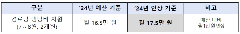 경로당 냉방비 지원단가 인상은 5월 30일 국무총리 주재 제40회 국정현안관계장관회의에서 확정된 사항으로 경로당을 대상으로 냉방비 지원단가를 월 16.5만 원에서 17.5만 원으로 월 1만 원 인상(6.1%)하여 추가 지원한다.