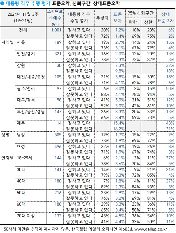 한국갤럽이 지난 19~21일 전국 만18세 이상 1001명을 대상으로 조사해 22일 공개한 여론조사 결과 윤 대통령의 직무수행 긍정 평가는 전주와 동일한 20%로 집계됐다. 부정 평가는 1%포인트(p) 오른 72%였다.