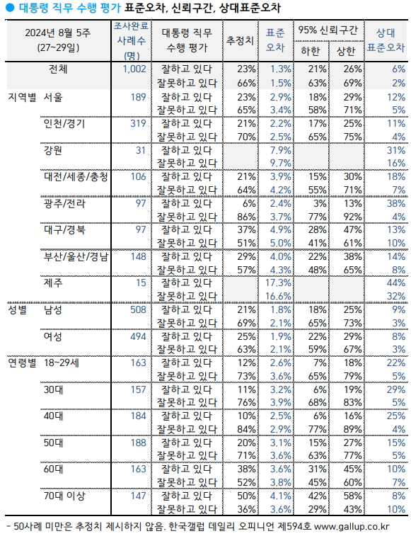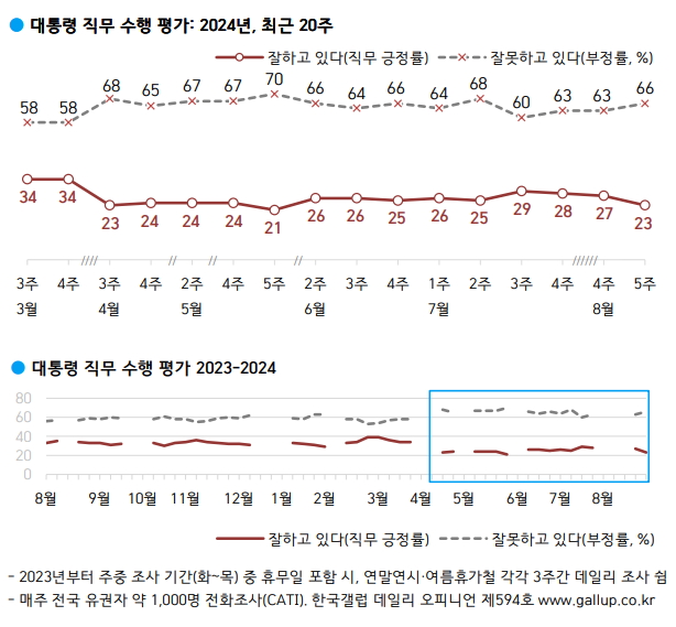 한국갤럽이 지난 27일부터 사흘간 전국 성인 1002명을 대상으로 조사해 이날 발표한 여론조사 결과를 보면, 윤 대통령 국정 수행에 대한 긍정 평가는 23%였다. 직전 조사 대비 4%포인트 하락한 수치다. 부정 평가는 직전 조사 대비 3%포인트 상승한 66%로 조사됐다.