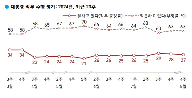 여론조사 기관 한국갤럽의 8월 네째주 조사에서 윤석열 대통령의 직무수행 긍정 평가가 27%로 조사됐다.