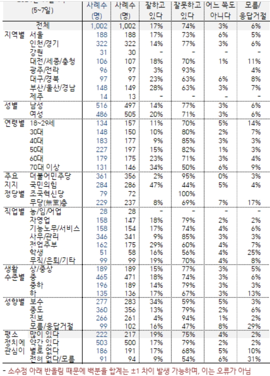 한국갤럽이 지난 5~7일 전국 성인 1002명을 대상으로 조사(오차범위 95% 신뢰 수준에서 ±3.1%포인트)한 결과, 윤 대통령 직무 수행에 대한 긍정 평가는 17%, 부정 평가는 74%로 나타났다. 지난 1일 한국갤럽이 발표한 여론조사에서 윤 대통령 지지율은 19%를 기록하며 처음으로 10%대로 추락했다. 한 주 사이에 다시 2%포인트가 추락한 것이다.
