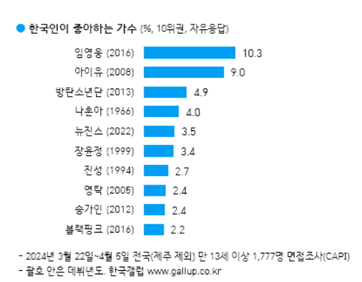 · 좋아하는 가수: '임영웅'(10.3%), 남성·10~30대는 '아이유' 더 선호