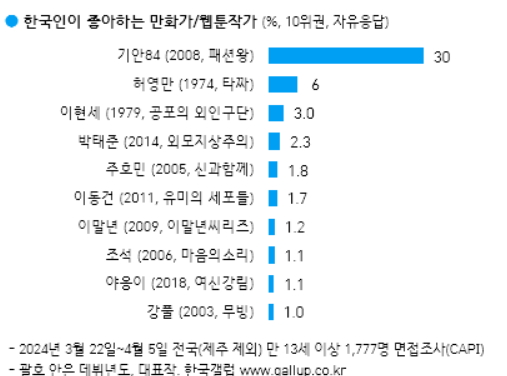 · 좋아하는 만화가/웹툰작가: '기안84'(30%), '허영만', '이현세'...