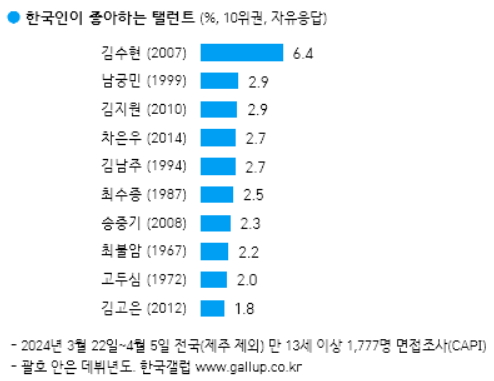 9일 한국갤럽은 지난 3월 22일부터 4월 5일까지 제주를 제외한 전국에서 만 13세 이상 1,777명을 상대로 면접 조사한 결과를 발표했다. 조사주제는 '한국인이 좋아하는 50가지 [사람2편] 2004-2024'이다. 조사 항목은 가수, 탤런트, 영화배우, 예능방송인/코미디언, 만화가/웹툰 작가, 유튜버 등이다. 이번 조사는 '생존 여부와 상관없이 가장 좋아하는 사람'을 한 명씩 응답받은 것으로 작고하신 분들도 다수 포함돼 있다. 조사 결과를 요약하면 다음과 같다.