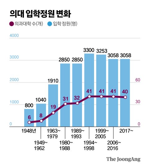 3.한국은 1960년대 초, 1980년대 초 두 차례 각각 1,000명 정도씩 늘었다. 이후 30년 넘게 변화 없었다. 이번 증원으로 1,500명 정도가 늘어난 2025학년도 정원은 4,487명. 의대 신입생 1인당 인구 1만 1,500명 정도.
