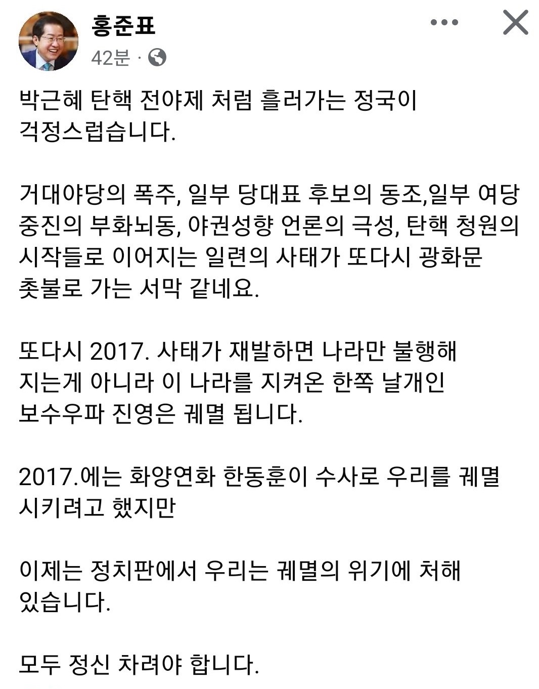 홍준표 대구시장이 7월 3일 자신의 페이스북에 정국이 탄핵으로 가고 있다는 글을 올렸습니다. 여당 인사들도 탄핵이 현실이라는 인식을 갖기 시작했고 이를 공공연하게 말하는 상황에 이르렀습니다. 아래 전문입니다.