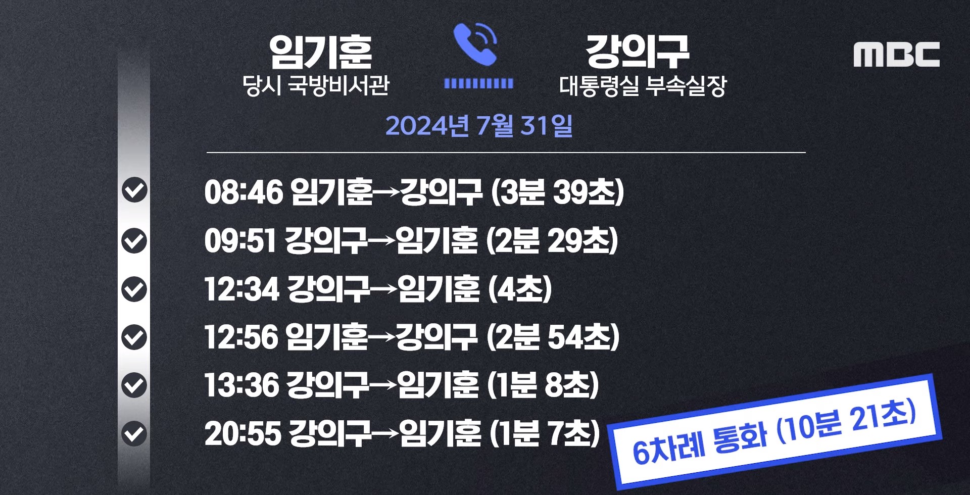 이날 강의구 부속실장은 오전 8시 46분 첫 통화를 시작으로 대통령실 임기훈 국방비서관과 하루 동안 6차례 통화한 기록이 확인되었습니다. 임기훈 국방비서관은 대통령실에서 채 상병 사건과 관련이 있는 인물이고, 실제로 국방부, 해병대와 여러 차례 통화 기록이 확인된 사람입니다.
