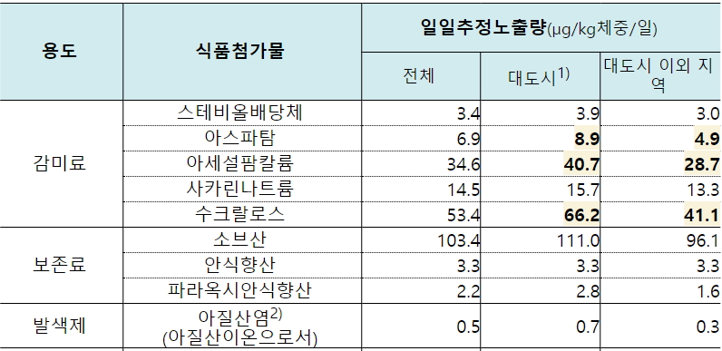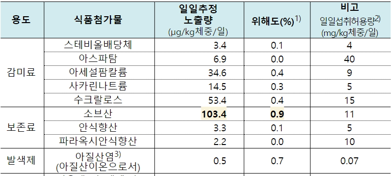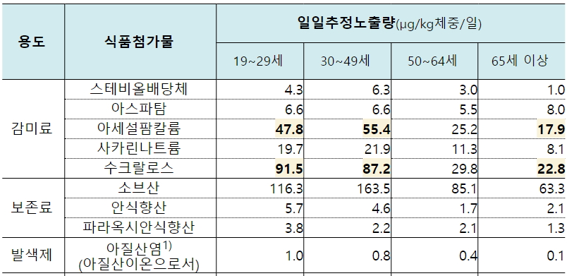 그 결과, 1인 가구가 하루에 섭취한 식품첨가물의 양은 0.0~103.4 μg/kg체중/일로, 1일 최대 섭취 허용량의 0.9%이하 수준인 것으로 확인되었다. 따라서, 1인 가구가 가공식품을 통해 섭취하는 식품첨가물은 인체에 위해 발생 우려가 없는 안전한 수준인 것으로 판단된다. 또한 널리 알려진 식품첨가물로 단맛을 내는 감미료의 경우 연령별로 젊은층(19~49세)의 섭취량이 상대적으로 많은 것으로 조사되었다.