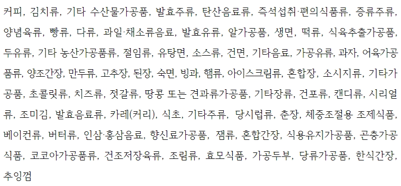 평가원은 1인 가구가 선호하는 커피, 김치류, 발효주류, 탄산음료류 등 식품유형 69종*(붙임 1)에 많이 사용된 감미료, 보존료 등 식품첨가물 28종을 조사대상으로 하였다. 국민건강영양조사('19~'21)에 따른 1인 가구의 섭취량과 섭취빈도 등 고려했다.