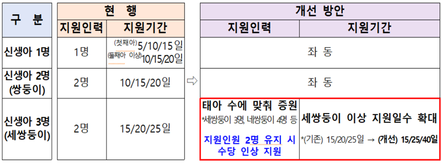 1) 세 쌍둥이 이상 출산 가정에 산모‧신생아 건강관리 지원인력을 출생아 수에 맞춰 지원 (기존 최대 2명),