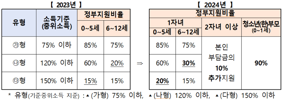 3) 기준 중위소득 150% 이하 청소년‧한부모가 1세 이하 아동 양육의 경우 정부에서 비용을 90%까지 부담.