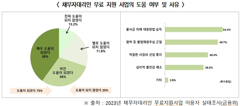 채무자대리인 무료 지원 사업은 미등록ㆍ등록 대부업자로부터 불법 채권추심피해(우려)가 있거나 법정 최고금리(연 20%) 초과 대출을 받은 서민ㆍ취약계층을 대상으로 정부가 지원하는 무료 법률서비스이다. 제공 서비스는 크게 두 가지이다.
