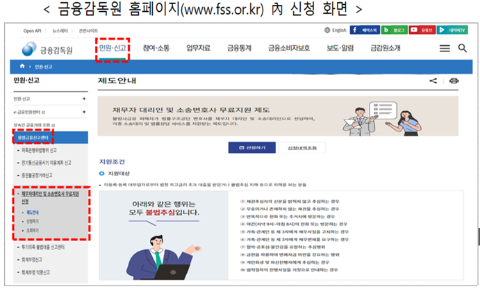 금감원 홈페이지, 불법사금융신고센터(☏1332) 또는 법률구조공단(☏132)을 통해 신청할 수 있다.