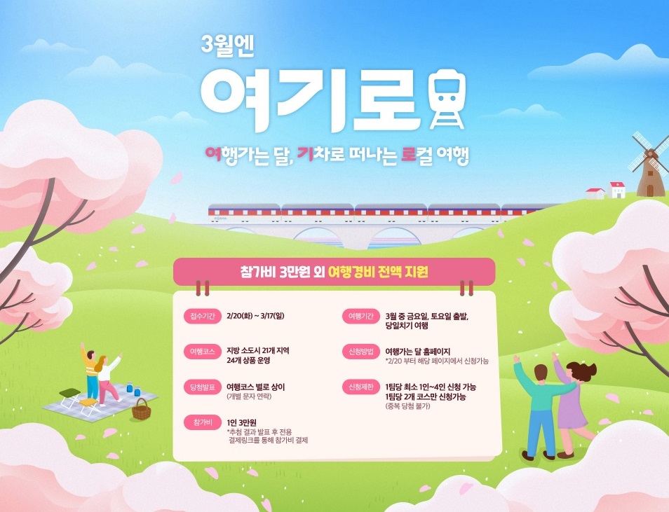 3월은 쌀쌀하지만 남녘에서는 매화, 산수유 등 일찍 피는 봄꽃을 만날 수 있는 계절입니다. 해마다 6월을 ‘여행 가는 달’로 지정해 다양한 할인 행사와 관광 상품을 지원해오던 정부가 올해는 경기 진작을 위해 3월을 ‘여행 가는 달’에 추가했습니다. 3월 중 저렴하게 즐길 수 있는 여러 여행 상품과 교통, 숙박 할인 정보들을 모아 봤습니다.