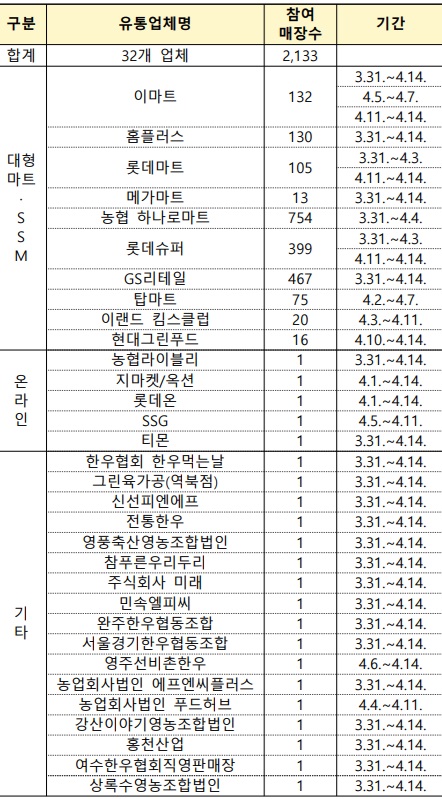 향후 4월 11~12, 4월 22~23일 대형마트 등에서 할인 행사