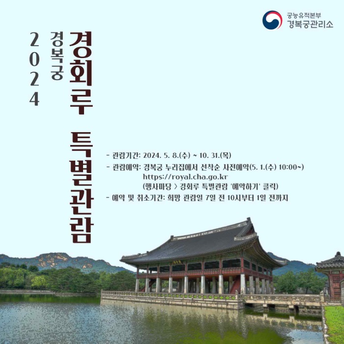 경복궁 휴궁일인 화요일과 법정공휴일은 운영하지 않습니다. '2024 봄 궁중문화축전' 기간 중 외국인 대상 경회루 특별관람은 5월 1일부터 5일까지 별도로 운영합니다.