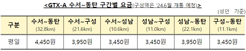 이번에 개통하는 수서~동탄 구간 GTX의 기본요금은 3,200원이며, 수서~동탄 구간 요금 4,450원, 수서~성남 구간 3,450원이다. 여기에 5km 마다 거리요금 250원(10km 초과 시)이 추가되는 구조다. 같은 수서~동탄 구간을 운행하는 SRT가 GTX와 비슷하게 17분 정도 걸리는 점을 감안하면 요금은 훨씬 낮으며, 여기에 각종 할인 프로그램 등을 활용하면 더욱 저렴해진다.