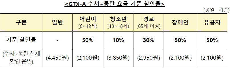 다만, 어린이·청소년·경로·장애인·유공자가 할인 혜택을 받으려면 기존에 발급 받은 선·후불 교통카드를 반드시 지참해야 한다. GTX 역에서는 다른 전철역과 동일하게 성인·어린이·청소년용 선불교통카드만 구입이 가능하다. GTX용 1회권은 6월 1일부터 각 역에서 구입 가능하다.